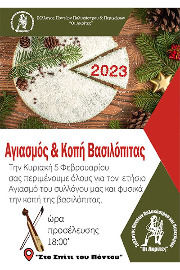 Ο Πρόεδρος και το Δ.Σ. του Συλλόγου Ποντίων Πολυκάστρου και περιχώρων «Οι Ακρίτες» προσκαλούν τα μέλη και τους φίλους του Συλλόγου, την Κυριακή 5 Φεβρουαρίου 2023, στην κοπή της πρωτοχρονιάτικης πίτας, στο "ΣΠΙΤΙ ΤΟΥ ΠΟΝΤΟΥ" και ώρα 6.00μ.μ.