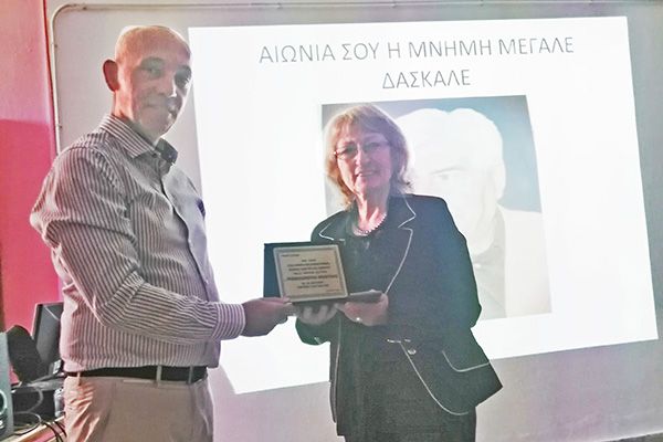 Την τιμητική πλακέτα παρέλαβε από τον Διευθυντή Γυμνασίου Δημήτριο Τζαβέλλα η χήρα του εκλιπόντος κα. Αστερόπη Κανδηλανάπτη.