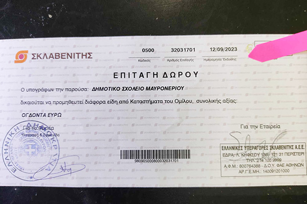 Το Δημοτικό Σχολείο του Μαυρονερίου ευχαριστεί θερμά το κατάστημα ΣΚΛΑΒΕΝΙΤΗΣ Κιλκίς για τη χορηγία σημαντικού ποσού που προσέφερε στους μαθητές και στις μαθήτριες του σχολείου μας!