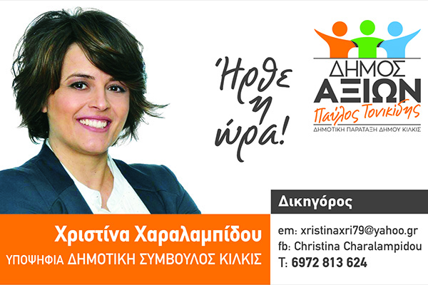 Νέα παρουσία πολλά υποσχόμενη. Νέα επιστήμονας. Με συγκροτημένη σκέψη, ποιότητα ιδεών και λόγο μεστό, καθαρό. Με άριστες συστάσεις από τους χώρους όπου δραστηριοποιείται. Αυτή είναι η δικηγόρος Χριστίνα Χαραλαμπίδου. Υποψήφια δημοτική σύμβουλος με την παράταξη ΔΗΜΟΣ ΑΞΙΩΝ και επικεφαλής τον Παύλο Τονικίδη. Σίγουρα από τις υποψηφιότητες που ξεχωρίζουν.
