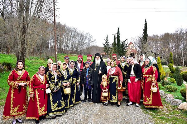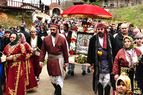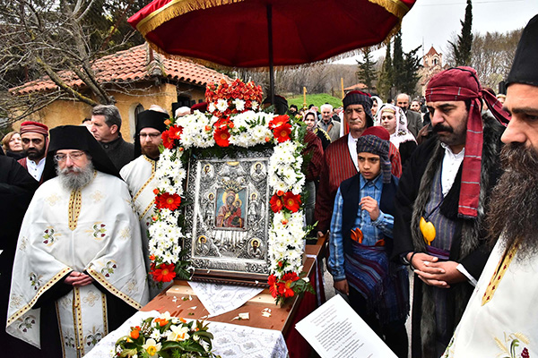 Ὅταν κατέφθασε ἡ πομπή μέ τήν ἱερά εἰκόνα, ἐψάλησαν θαυμάσια ἀπολυτίκια καί ὕμνοι στήν πύλη τῆς Μονῆς. Ἡ Φιλαρμονική Ὀρχήστρα τοῦ Δήμου Πέλλης ἐλάμπρυνε μέ τήν παρουσία της τήν ὑποδοχή τῆς Παναγίας. Τά δέ μέλη τῆς Φιλεκπαιδευτικῆς Ἀδελφότητας Καππαδοκῶν Ἀξοῦ «Ἁγία Μακρίνα», ἐνδεδυμένοι τίς παραδοσιακές τους φορεσιές ζωντάνεψαν μπροστά μας τήν Μικρασία, λίγο πρίν τόν ξεριζωμό, ὁ ὁποῖος τελικά καί ἔφερε τήν Παναγία μας ἐδῶ. Οἱ ἄνδρες σήκωσαν στούς ὤμους τους τήν Παναγία, ἐνῶ οἱ γυναῖκες ἔρραναν Αὐτήν μέ ἄνθη καί ροδοπέταλα. Στή συνέχεια ἐντός τοῦ Ναοῦ ἀνεπέμφθη δέηση καί μετά ἐψάλησαν οἱ Χαιρετισμοί πρός τήν Παναγία. Μέχρι ἀργά τό βράδυ προσήρχοντο πιστοί γιά νά προσκυνήσουν τήν Θεομήτορα.