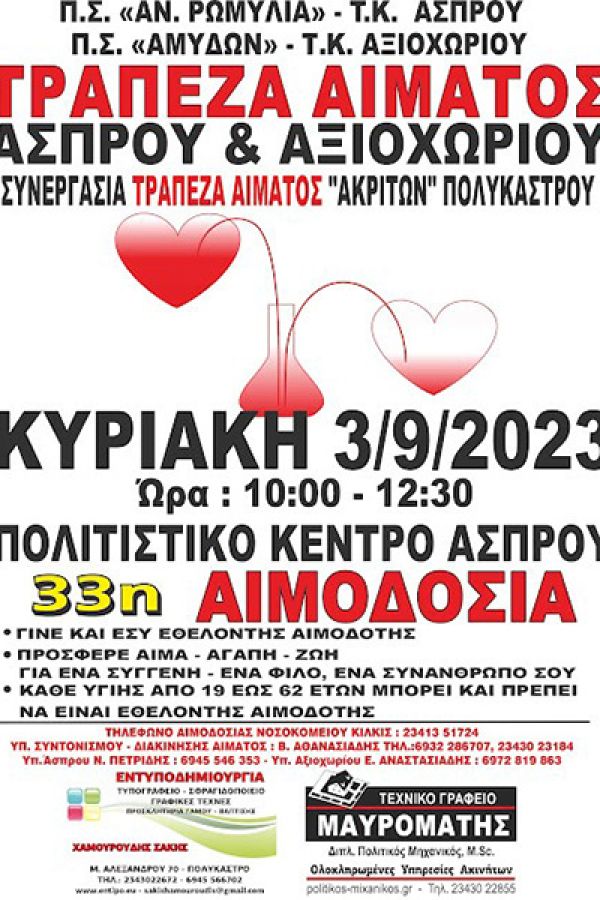 Την Κυριακή 3 Σεπτεμβρίου 2023 από τις 10:00 το πρωί μέχρι τις 12:30, στο "Πολιτιστικό κέντρο του Άσπρου", θα πραγματοποιηθεί η 33ή Εθελοντική Αιμοδοσίατων μελών της Τράπεζας Αίματος Άσπρου - Αξιοχωρίου.