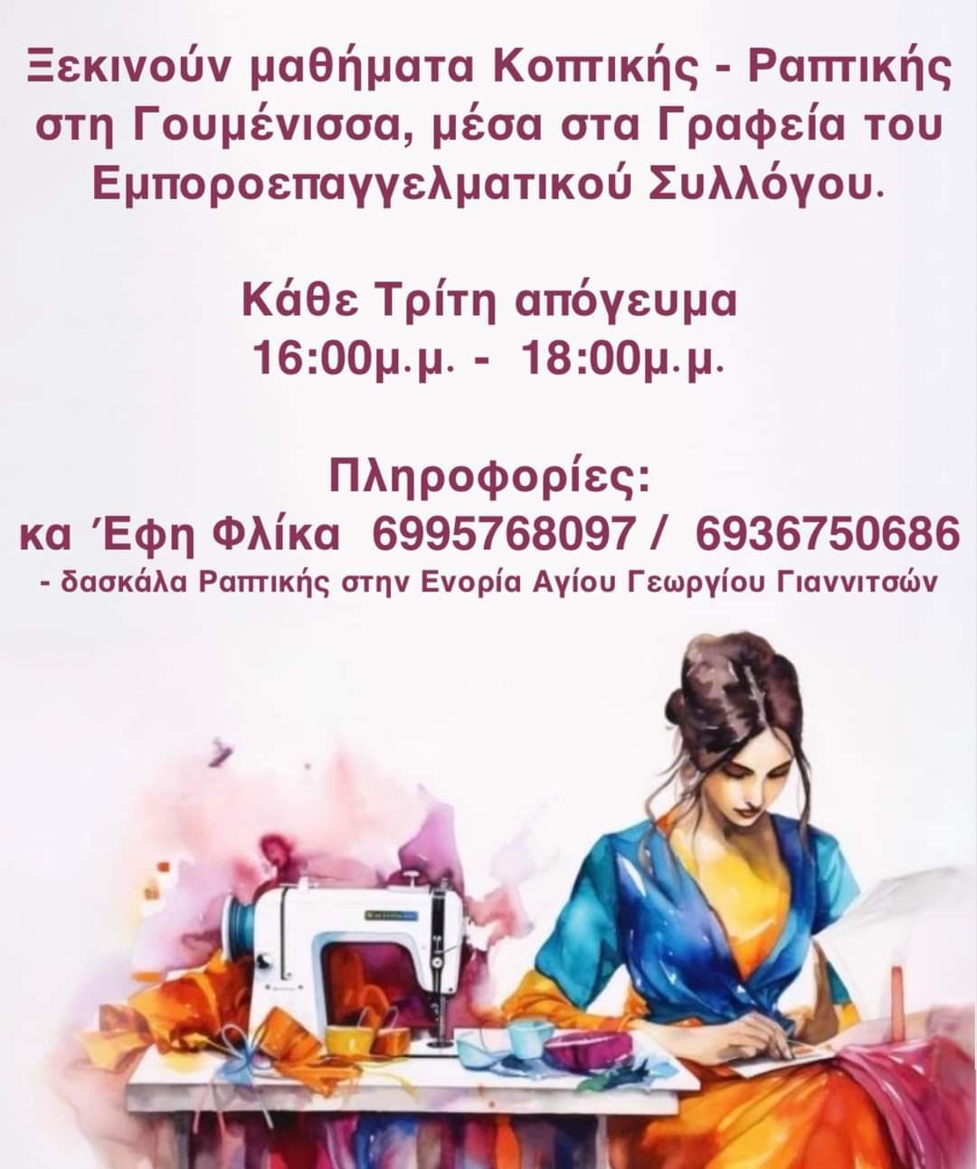 Δημιουργήθηκαν 2 τμήματα κάθε Τρίτη 2.00 με 4.00 και 4.00 με 6.00 μέσα στο Πολιτιστικό Κέντρο Γουμένισσας στα γραφεία του εμποροεπαγγελματικού συλλόγου.
