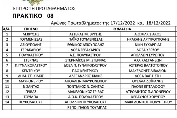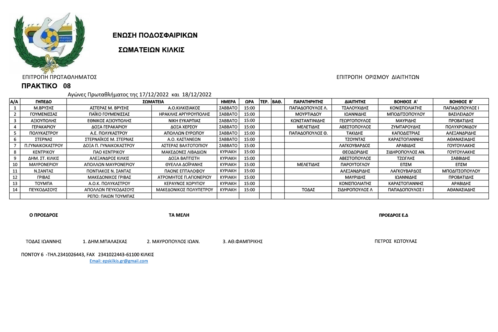 Από την Επιτροπή Ορισμού Διαιτητών της ΕΠΣ Κιλκίς ορίσθηκαν οι παρατηρητές και οι διαιτητές που θα διευθύνουν τους αγώνες της Α1 και Α κατηγορίας το Σάββατο 17 και την Κυριακή 18 Δεκεμβρίου 2022, στις 3 το απόγευμα, όπως καταγράφονται στο σχετικό πίνακα στην έκθεση εικόνων.