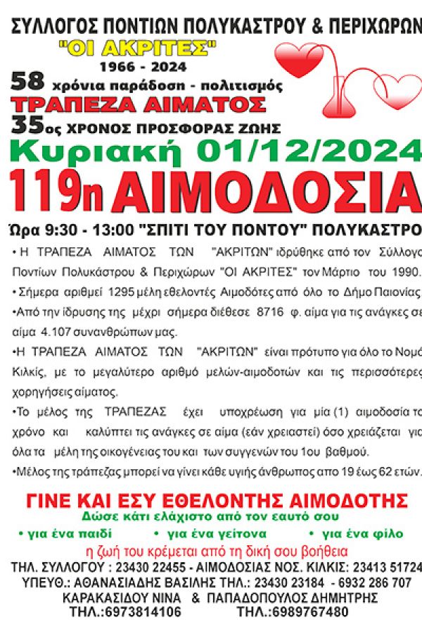 Η Τράπεζα Αίματος των Ακριτών Πολυκάστρου. Είναι η Τράπεζα αγάπης και προσφοράς η οποία λειτουργεί επί 35 χρόνια στους ΑΚΡΙΤΕΣ Πολυκάστρου, τον σύλλογο ο οποίος υπηρετεί την παράδοση και τον πολιτισμό επί 58 χρόνια, αφ’ όταν δηλαδή ιδρύθηκε.