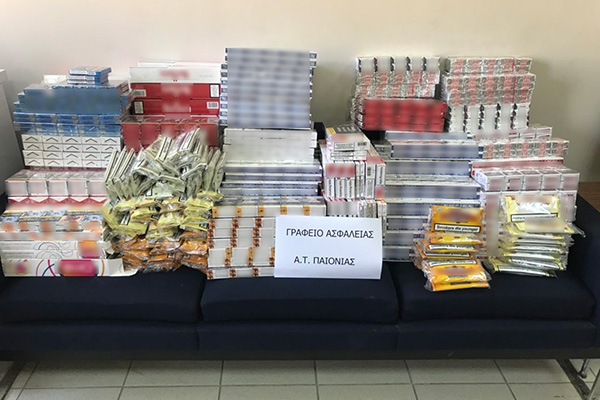 Στη δεύτερη περίπτωση, από αστυνομικούς του Αστυνομικού Τμήματος Παιονίας, συνελήφθησαν ένας άνδρας και μία γυναίκα, υπήκοοι ξένων χωρών, διότι διαπιστώθηκε να κατέχουν και να μεταφέρουν μέσα σε σάκους, 1.750 πακέτα τσιγάρων και 66 συσκευασίες με καπνό συνολικού βάρους 3 κιλών και 300 γραμμαρίων, για τα οποία δεν είχαν καταβληθεί οι νόμιμοι φόροι και δασμοί.