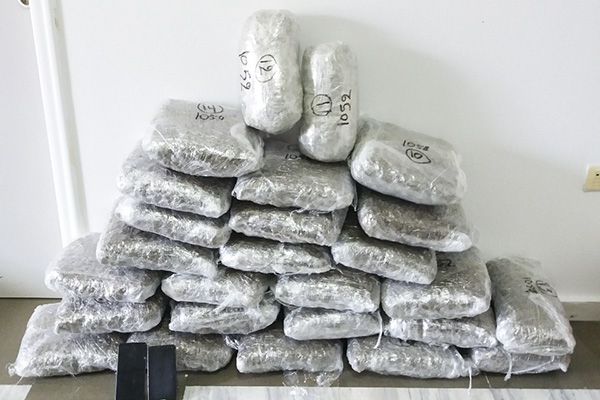 Όπως διαπιστώθηκε μετέφεραν στο όχημα δύο ταξιδιωτικούς σάκους, που περιείχαν 26 αυτοσχέδιες συσκευασίες με ποσότητες κάνναβης συνολικού βάρους 27 κιλών και 402 γραμμαρίων, οι οποίες κατασχέθηκαν.