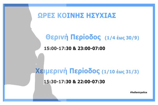Σύμφωνα με τη Αστυνομική Διάταξη 3 του 1996 οι ώρες μεσημβρινής και νυκτερινής ησυχίας είναι οι ακόλουθες: