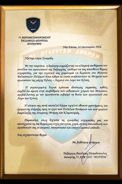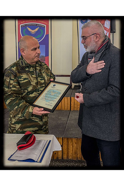 Ως επιστέγασμα της αναγνώρισης της πολύτιμης προσφοράς του, απονεμήθηκε στον Έφεδρο Αξιωματικό η τιμητική πλακέτα της Ταξιαρχίας.