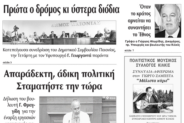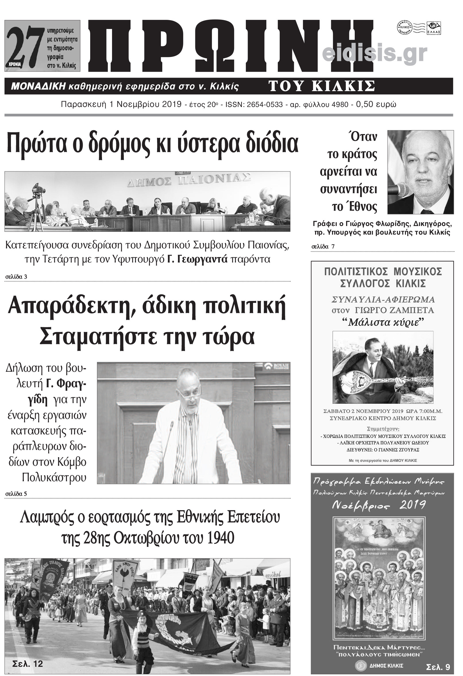 Διαβάστε το νέο πρωτοσέλιδο της Πρωινής του Κιλκίς, μοναδικής καθημερινής εφημερίδας του ν. Κιλκίς (1-11-2019)