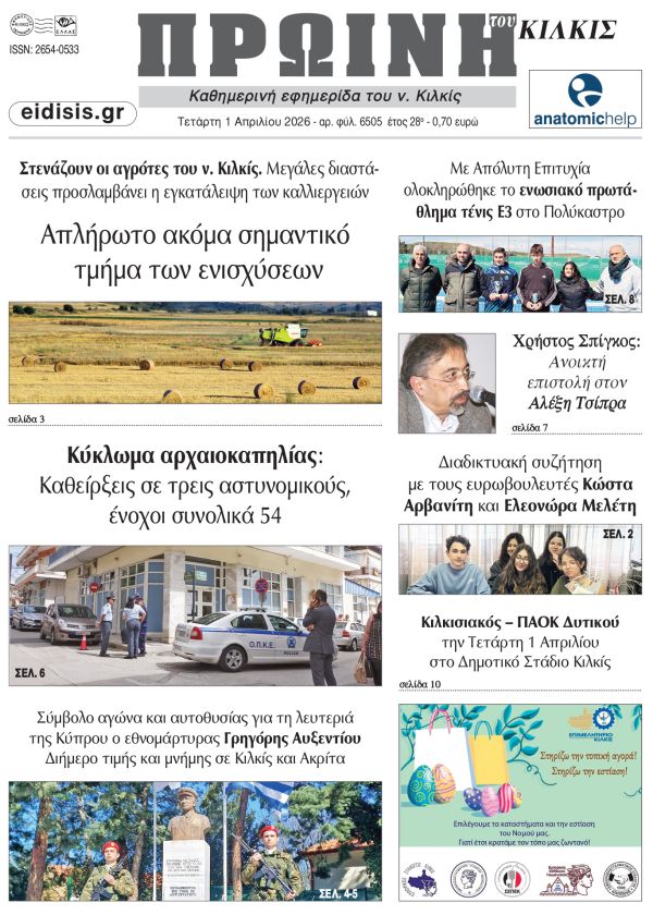 Διαβάστε το νέο πρωτοσέλιδο της Πρωινής του Κιλκίς, μοναδικής καθημερινής εφημερίδας του ν. Κιλκίς (1-4-2026)