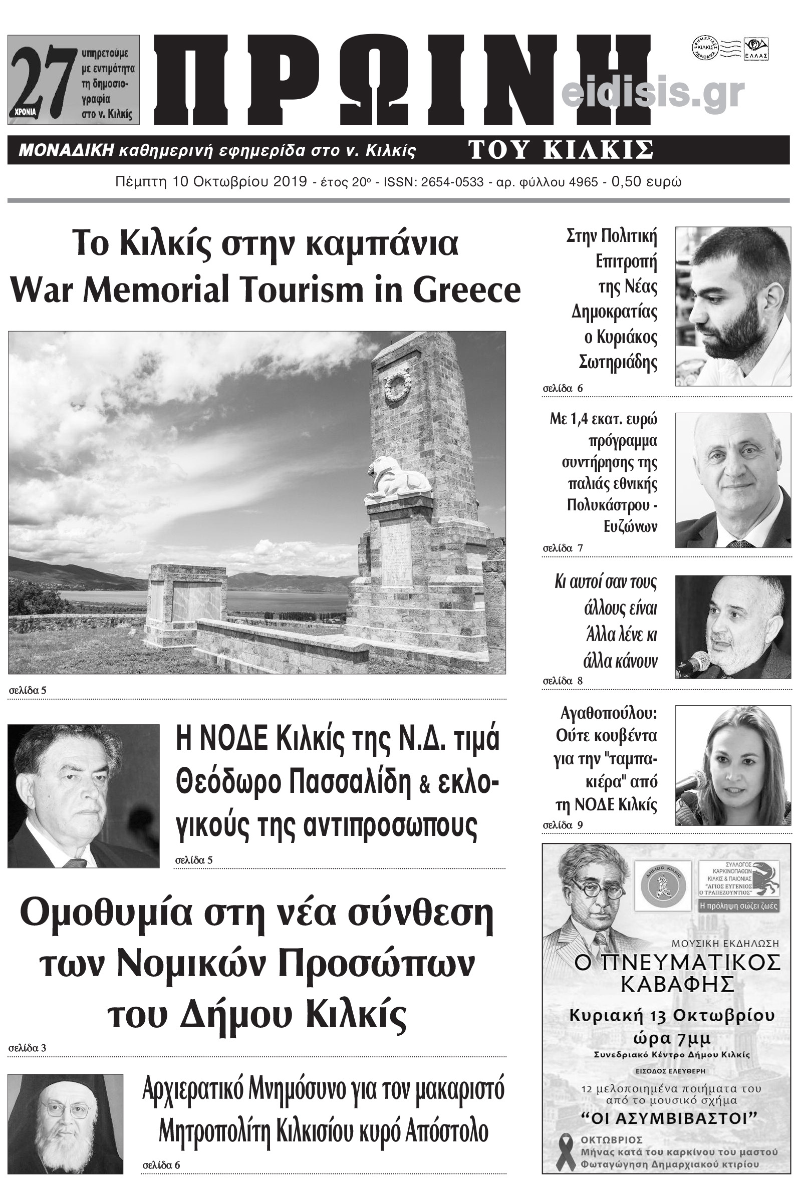 Διαβάστε το νέο πρωτοσέλιδο της Πρωινής του Κιλκίς, μοναδικής καθημερινής εφημερίδας του ν. Κιλκίς (10-10-2019)