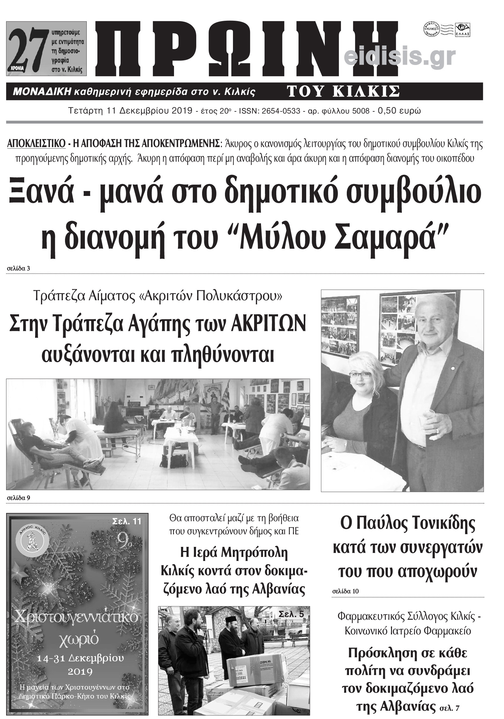 Διαβάστε το νέο πρωτοσέλιδο της Πρωινής του Κιλκίς, μοναδικής καθημερινής εφημερίδας του ν. Κιλκίς (11-12-2019)