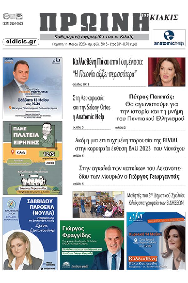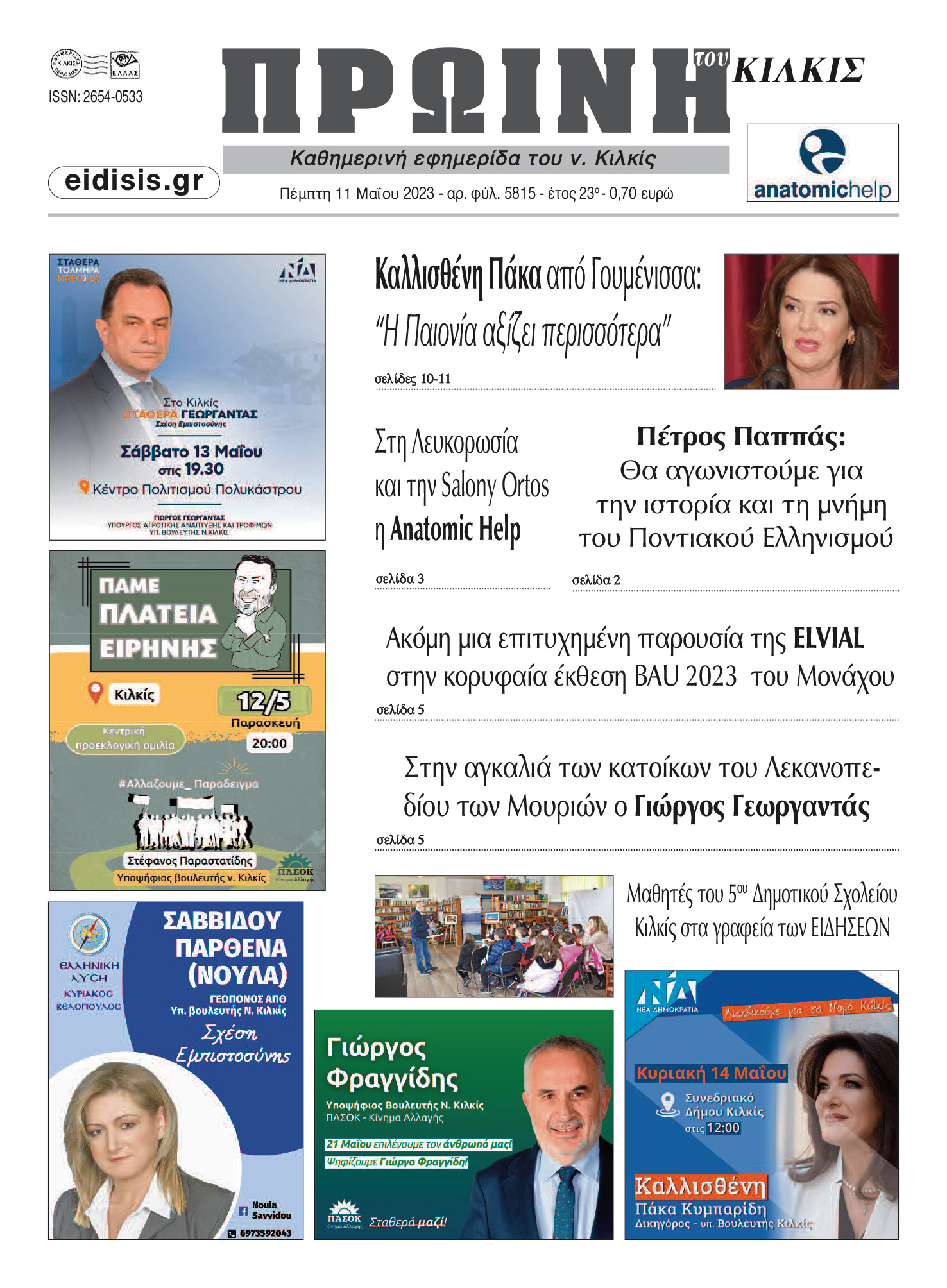 Διαβάστε το νέο πρωτοσέλιδο της Πρωινής του Κιλκίς, μοναδικής καθημερινής εφημερίδας του ν. Κιλκίς (11-5-2023)
