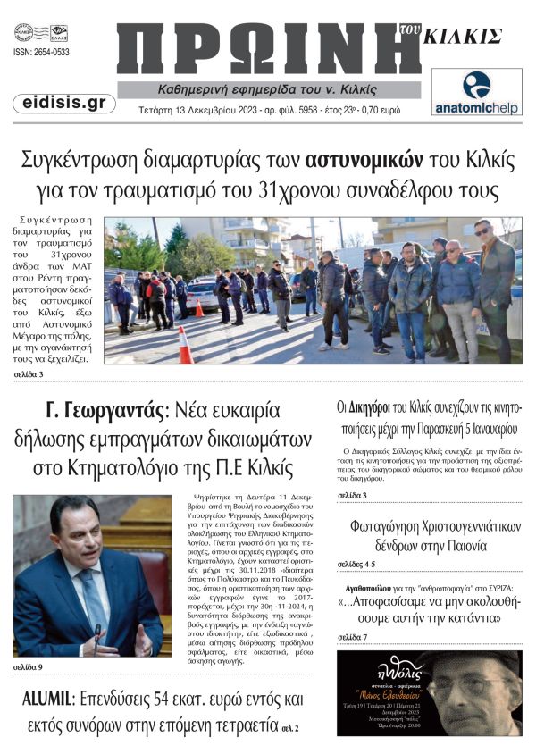 Διαβάστε το νέο πρωτοσέλιδο της Πρωινής του Κιλκίς, μοναδικής καθημερινής εφημερίδας του ν. Κιλκίς (13-12-2023)