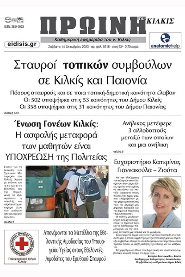 Διαβάστε το νέο πρωτοσέλιδο της Πρωινής του Κιλκίς, μοναδικής καθημερινής εφημερίδας του ν. Κιλκίς (14-10-2023)