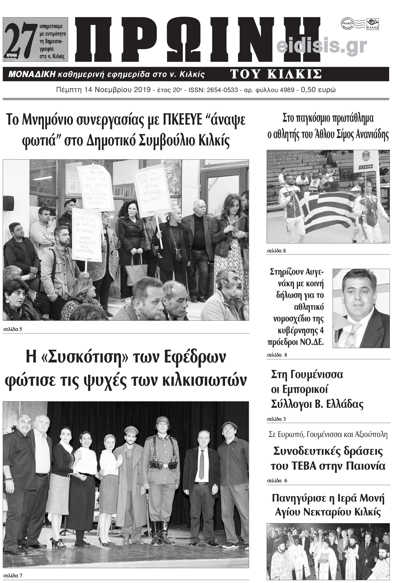 Διαβάστε το νέο πρωτοσέλιδο της Πρωινής του Κιλκίς, μοναδικής καθημερινής εφημερίδας του ν. Κιλκίς (14-11-2019)