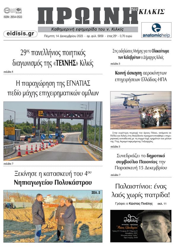 Διαβάστε το νέο πρωτοσέλιδο της Πρωινής του Κιλκίς, μοναδικής καθημερινής εφημερίδας του ν. Κιλκίς (14-12-2023)