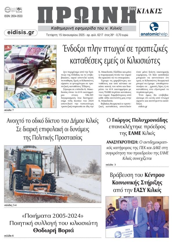 Διαβάστε το νέο πρωτοσέλιδο της Πρωινής του Κιλκίς, μοναδικής καθημερινής εφημερίδας του ν. Κιλκίς (15-1-2025)