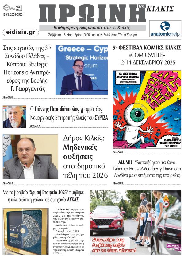 Διαβάστε το νέο πρωτοσέλιδο της Πρωινής του Κιλκίς, μοναδικής καθημερινής εφημερίδας του ν. Κιλκίς (15-11-2025)