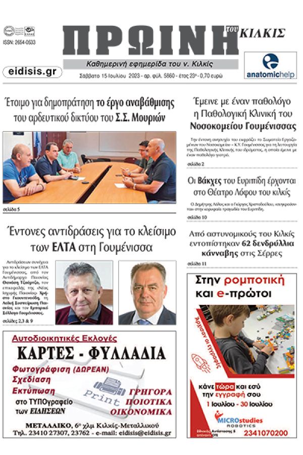 Διαβάστε το νέο πρωτοσέλιδο της Πρωινής του Κιλκίς, μοναδικής καθημερινής εφημερίδας του ν. Κιλκίς (15-7-2023)