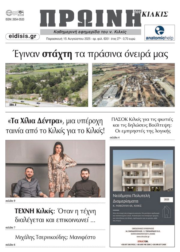 Διαβάστε το νέο πρωτοσέλιδο της Πρωινής του Κιλκίς, μοναδικής καθημερινής εφημερίδας του ν. Κιλκίς (15-8-2025)