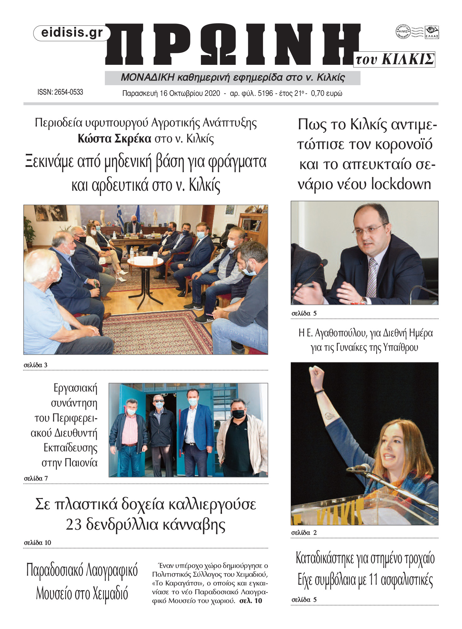 Διαβάστε το νέο πρωτοσέλιδο της Πρωινής του Κιλκίς, μοναδικής καθημερινής εφημερίδας του ν. Κιλκίς (16-10-2020)