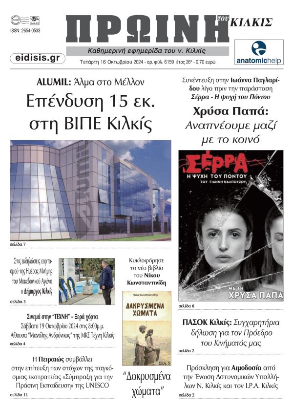 Διαβάστε το νέο πρωτοσέλιδο της Πρωινής του Κιλκίς, μοναδικής καθημερινής εφημερίδας του ν. Κιλκίς (16-10-2024)