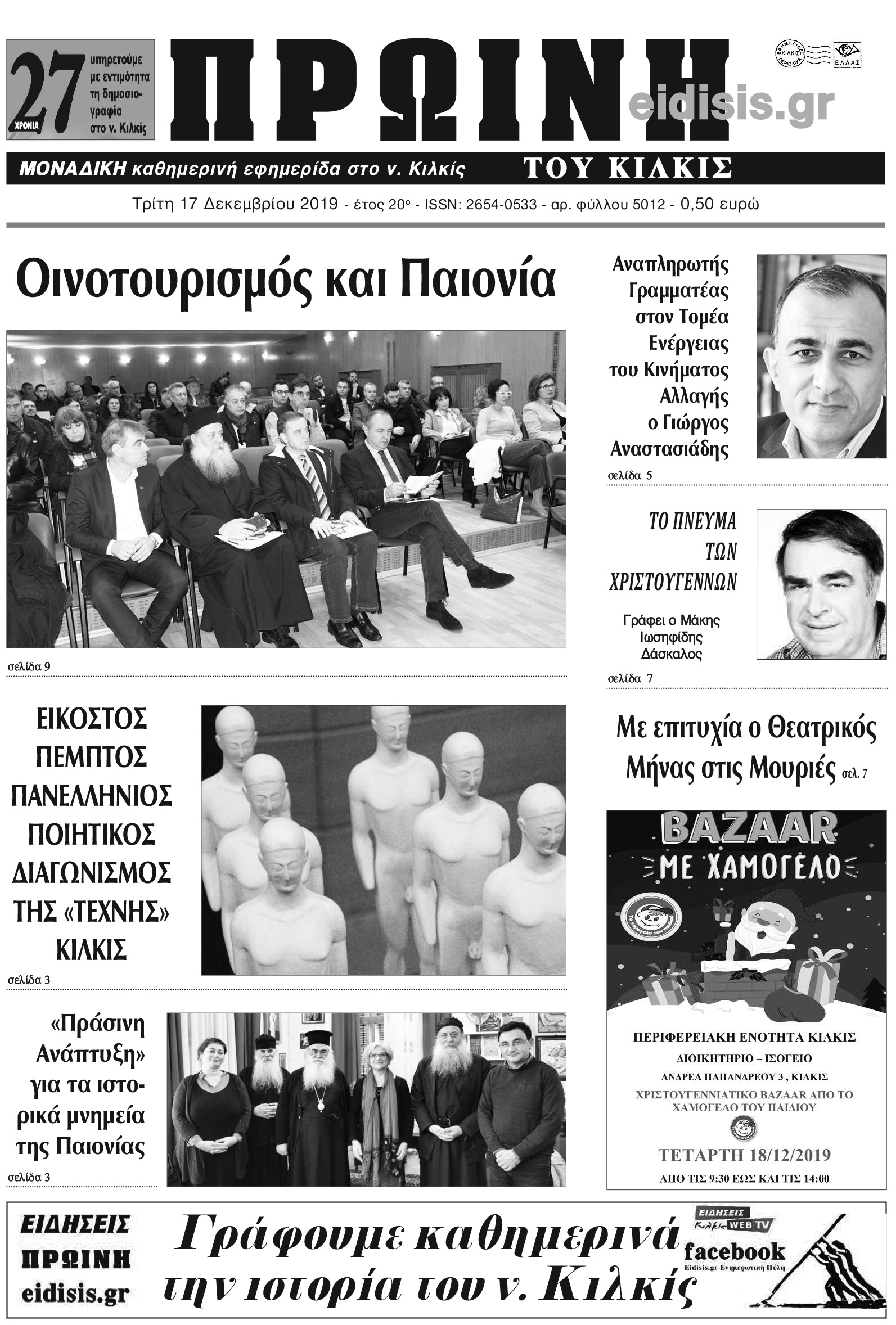 Διαβάστε το νέο πρωτοσέλιδο της Πρωινής του Κιλκίς, μοναδικής καθημερινής εφημερίδας του ν. Κιλκίς (17-12-2019)