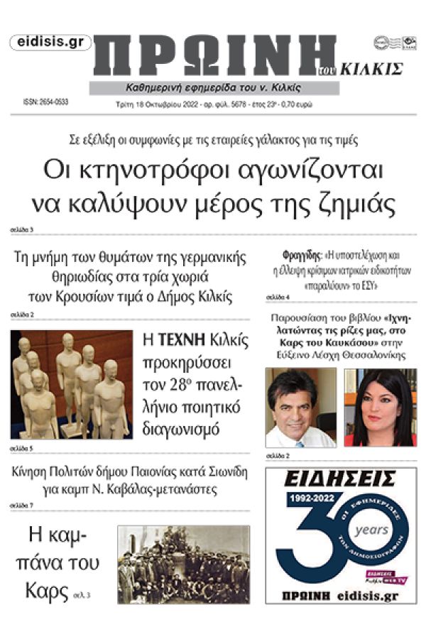 Διαβάστε το νέο πρωτοσέλιδο της Πρωινής του Κιλκίς, μοναδικής καθημερινής εφημερίδας του ν. Κιλκίς (18-10-2022)