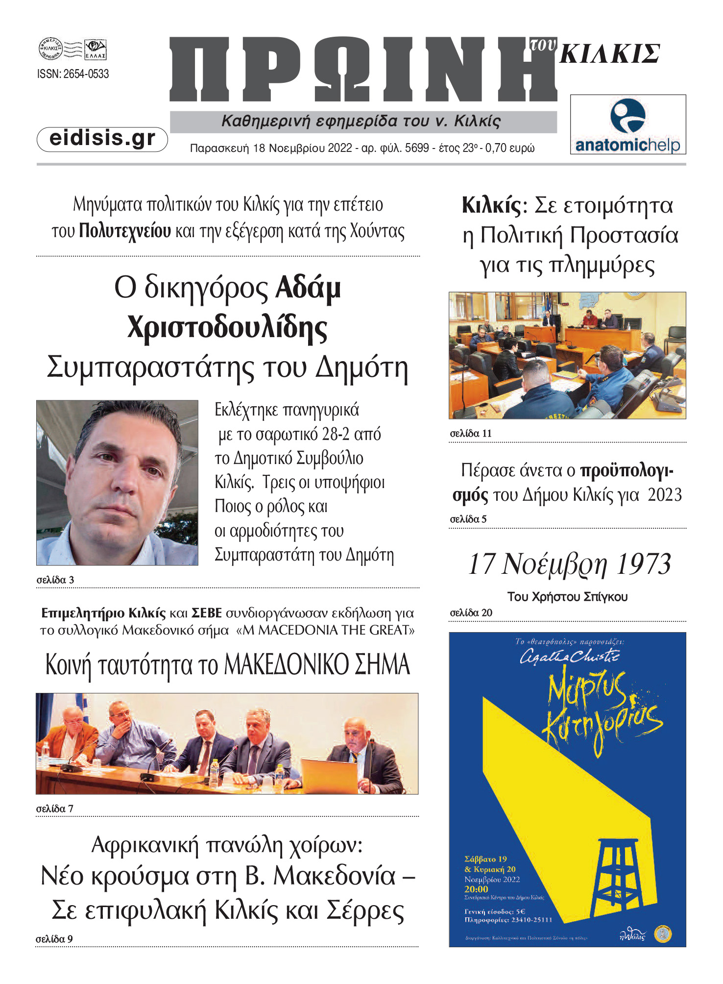 Διαβάστε το νέο πρωτοσέλιδο της Πρωινής του Κιλκίς, μοναδικής καθημερινής εφημερίδας του ν. Κιλκίς (18-11-2022)