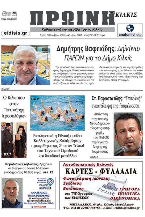 Διαβάστε το νέο πρωτοσέλιδο της Πρωινής του Κιλκίς, μοναδικής καθημερινής εφημερίδας του ν. Κιλκίς (18-7-2023)