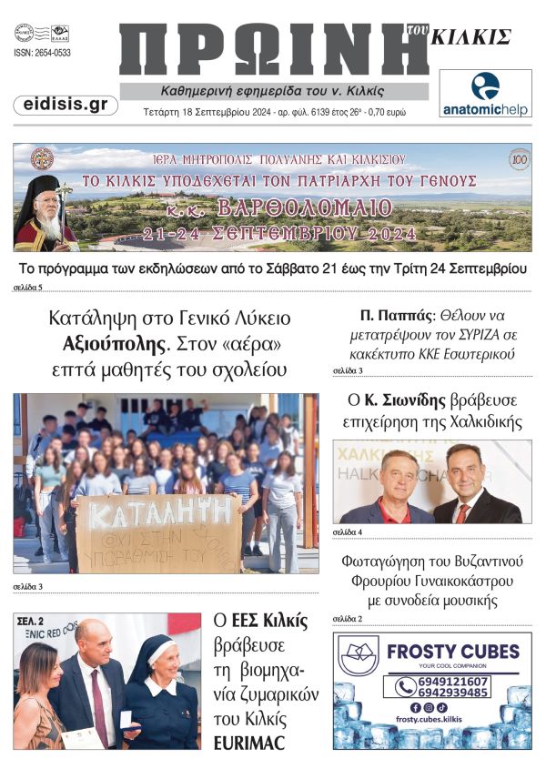 Διαβάστε το νέο πρωτοσέλιδο της Πρωινής του Κιλκίς, μοναδικής καθημερινής εφημερίδας του ν. Κιλκίς (18-9-2024)