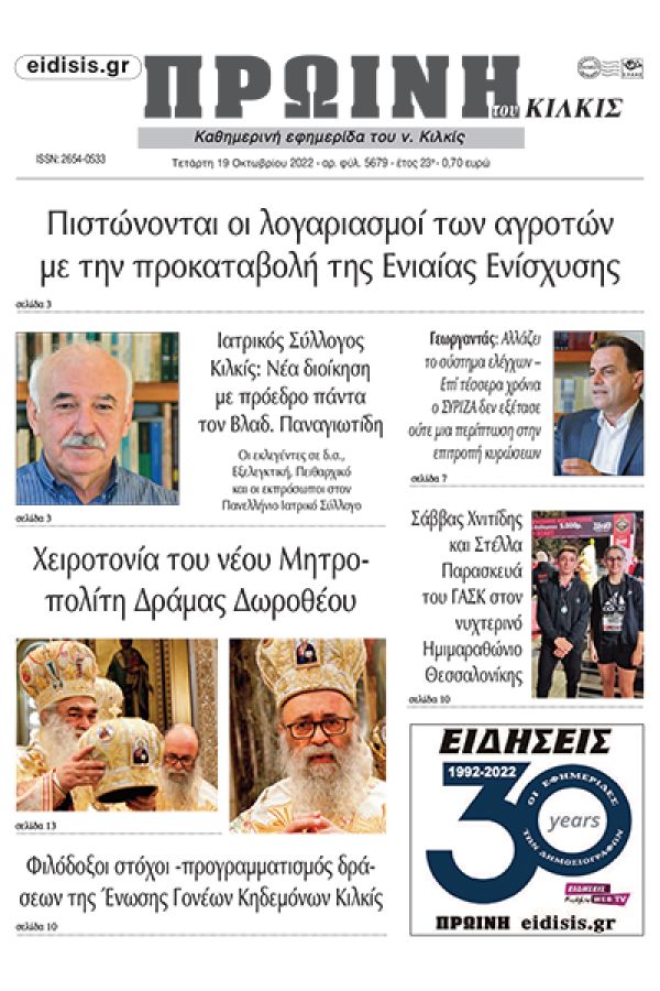 Διαβάστε το νέο πρωτοσέλιδο της Πρωινής του Κιλκίς, μοναδικής καθημερινής εφημερίδας του ν. Κιλκίς (19-10-2022)