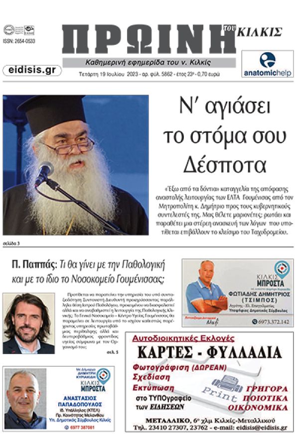Διαβάστε το νέο πρωτοσέλιδο της Πρωινής του Κιλκίς, μοναδικής καθημερινής εφημερίδας του ν. Κιλκίς (19-7-2023)