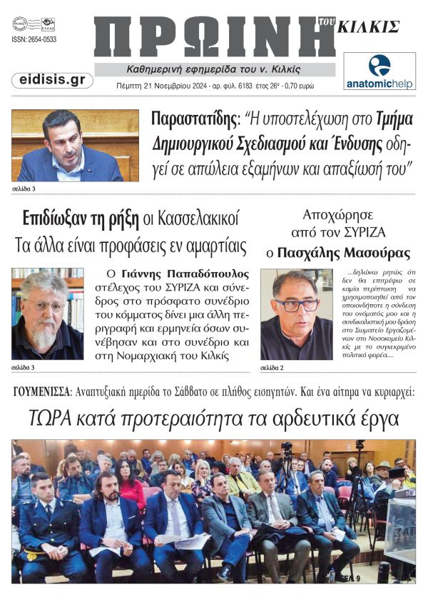 Διαβάστε το νέο πρωτοσέλιδο της Πρωινής του Κιλκίς, μοναδικής καθημερινής εφημερίδας του ν. Κιλκίς (20-11-2024)