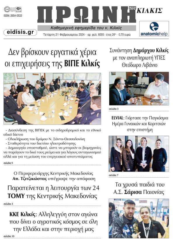 Διαβάστε το νέο πρωτοσέλιδο της Πρωινής του Κιλκίς, μοναδικής καθημερινής εφημερίδας του ν. Κιλκίς (21-2-2024)