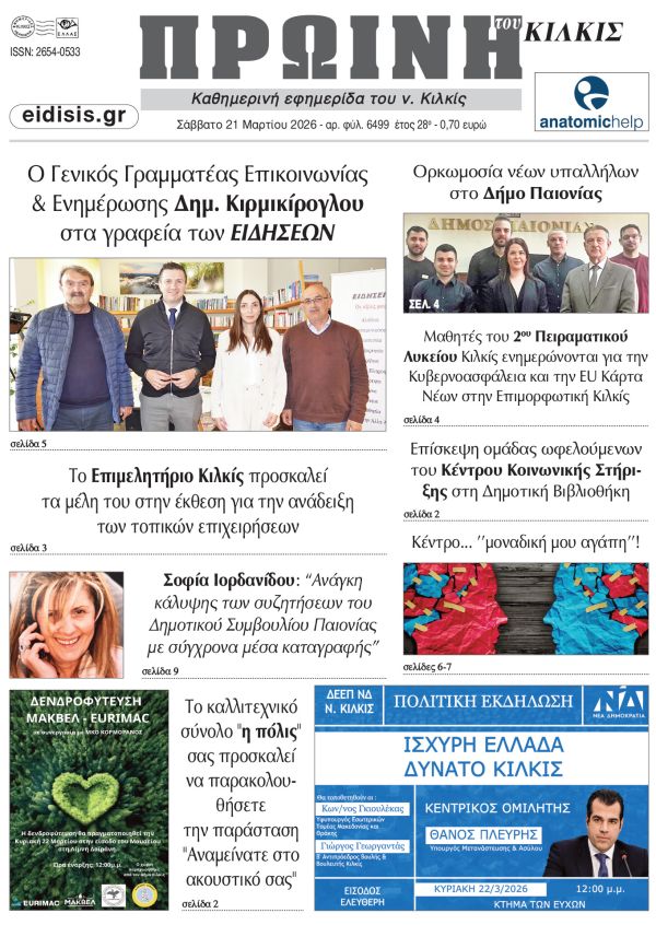 Διαβάστε το νέο πρωτοσέλιδο της Πρωινής του Κιλκίς, μοναδικής καθημερινής εφημερίδας του ν. Κιλκίς (21-3-2026)