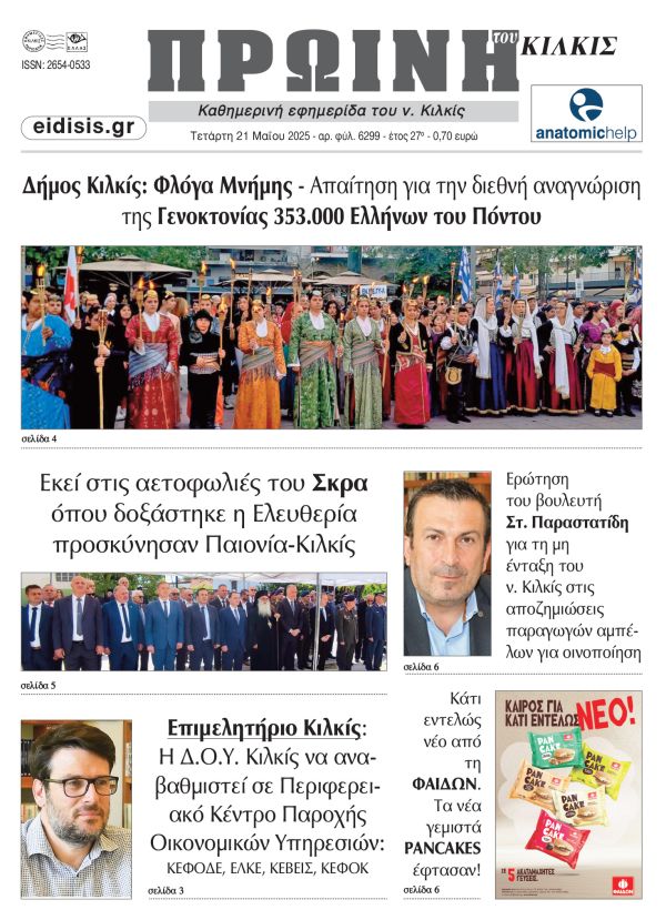 Διαβάστε το νέο πρωτοσέλιδο της Πρωινής του Κιλκίς, μοναδικής καθημερινής εφημερίδας του ν. Κιλκίς (21-5-2025)