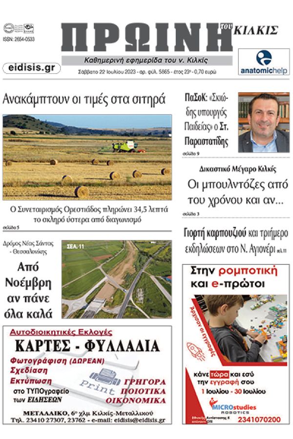 Διαβάστε το νέο πρωτοσέλιδο της Πρωινής του Κιλκίς, μοναδικής καθημερινής εφημερίδας του ν. Κιλκίς (22-7-2023)