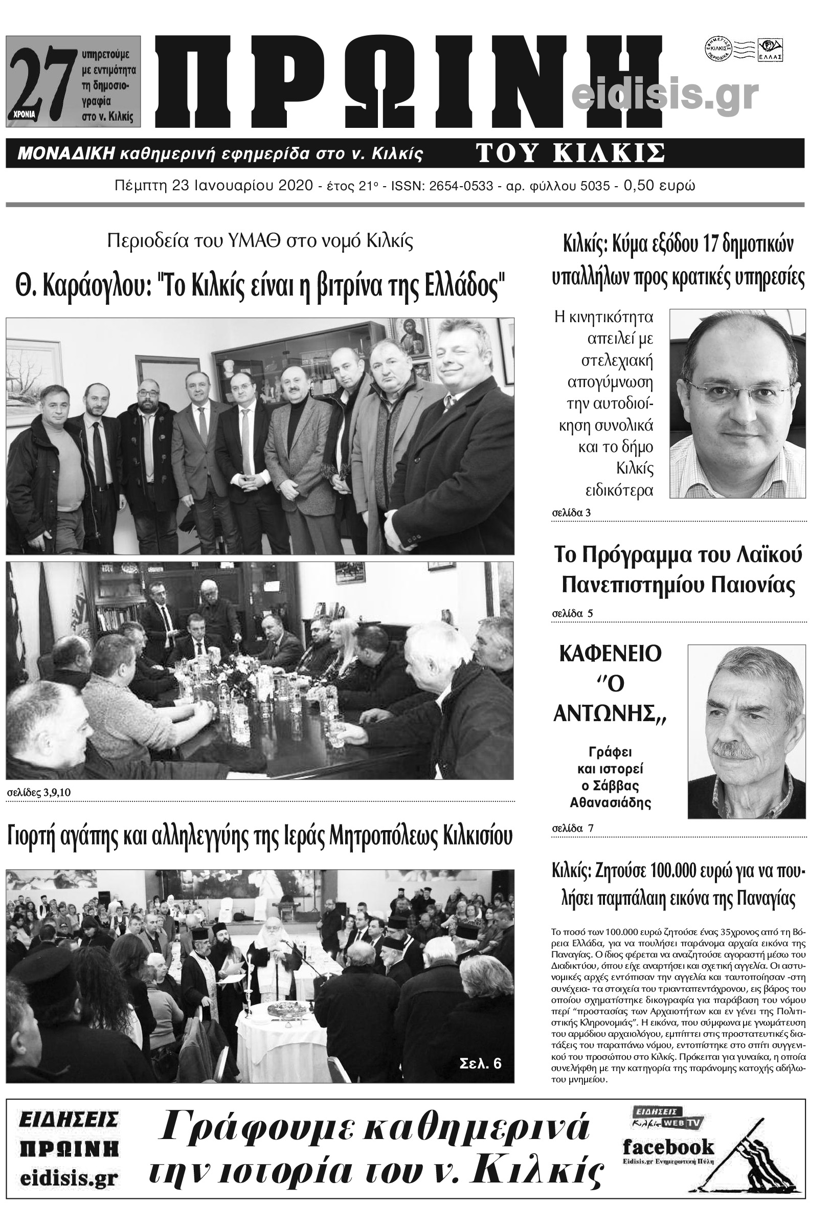 Διαβάστε το νέο πρωτοσέλιδο της Πρωινής του Κιλκίς, μοναδικής καθημερινής εφημερίδας του ν. Κιλκίς (23-1-2020)