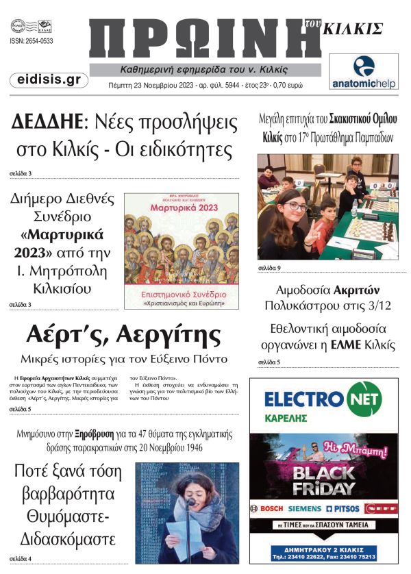 Διαβάστε το νέο πρωτοσέλιδο της Πρωινής του Κιλκίς, μοναδικής καθημερινής εφημερίδας του ν. Κιλκίς (23-11-2023)