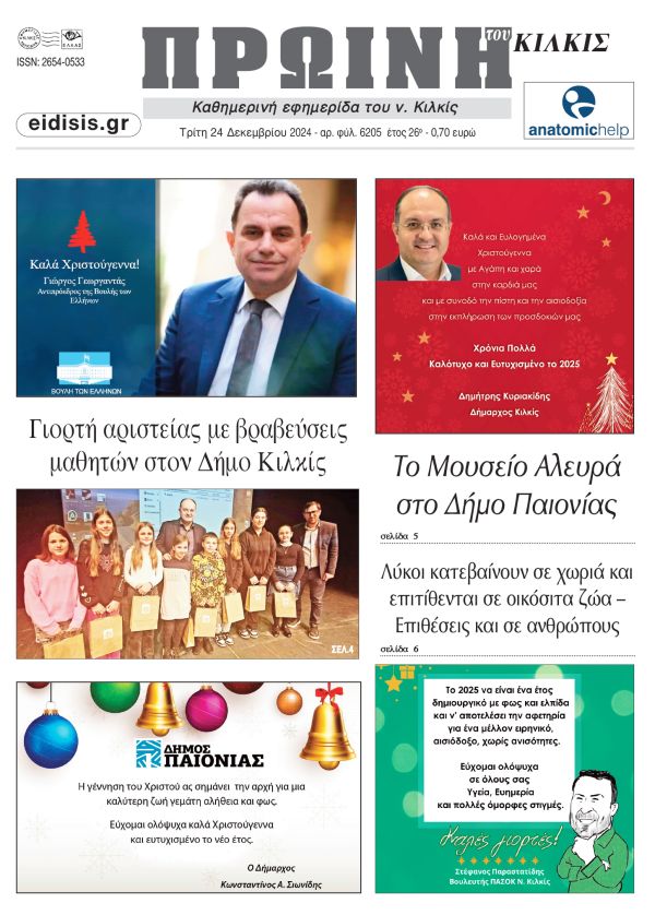 Διαβάστε το νέο πρωτοσέλιδο της ΠΡΩΙΝΗΣ του Κιλκίς, μοναδικής καθημερινής εφημερίδας του ν. Κιλκίς (24-12-2024)