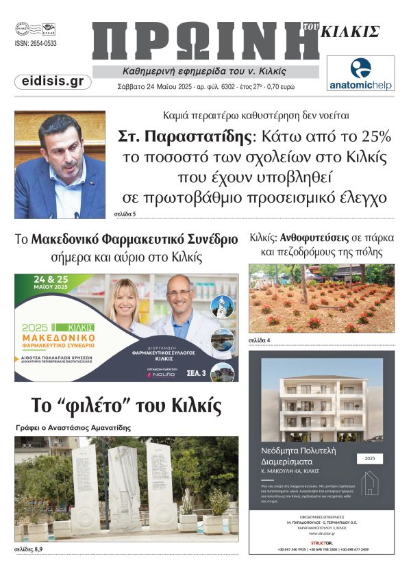 Διαβάστε το νέο πρωτοσέλιδο της Πρωινής του Κιλκίς, μοναδικής καθημερινής εφημερίδας του ν. Κιλκίς (24-5-2025)