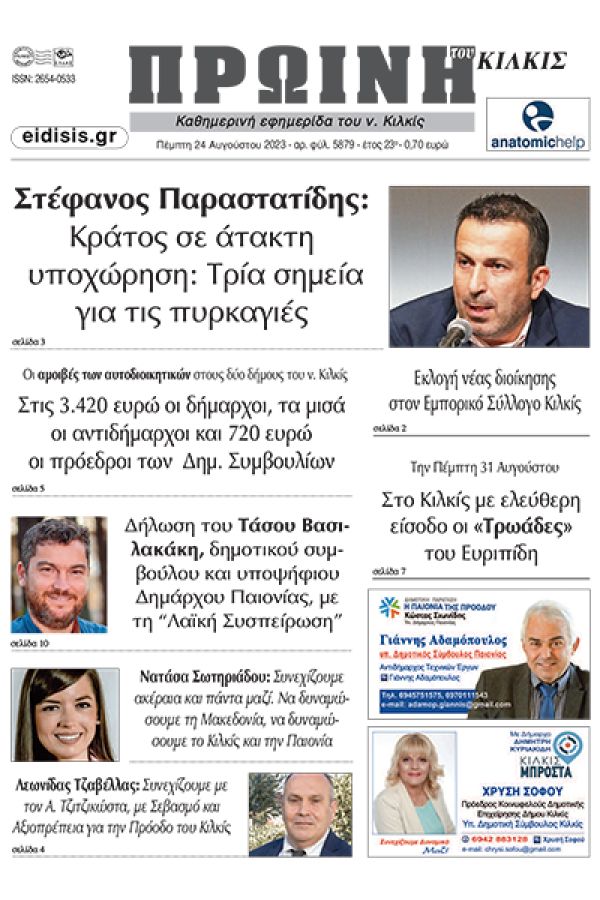 Διαβάστε το νέο πρωτοσέλιδο της Πρωινής του Κιλκίς, μοναδικής καθημερινής εφημερίδας του ν. Κιλκίς (24-8-2023)