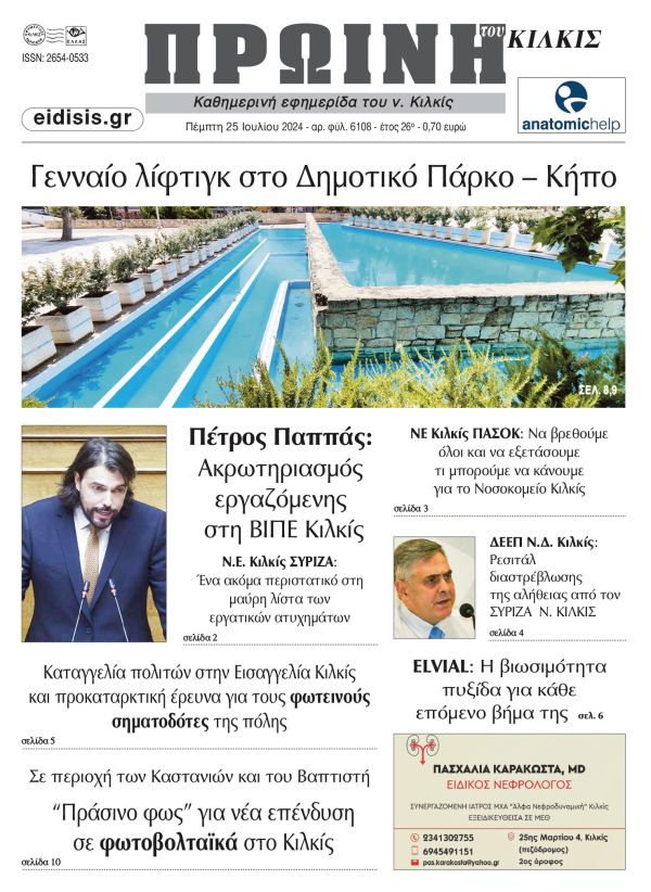 Διαβάστε το νέο πρωτοσέλιδο της Πρωινής του Κιλκίς, μοναδικής καθημερινής εφημερίδας του ν. Κιλκίς (25-7-2024)