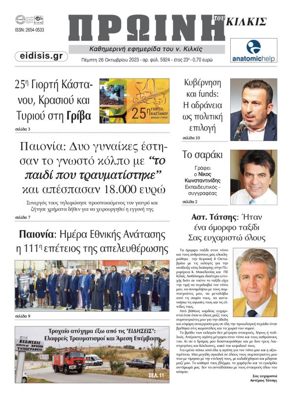 Διαβάστε το νέο πρωτοσέλιδο της ΠΡΩΙΝΗΣ του Κιλκίς, μοναδικής καθημερινής εφημερίδας του ν. Κιλκίς (26-10-2023)