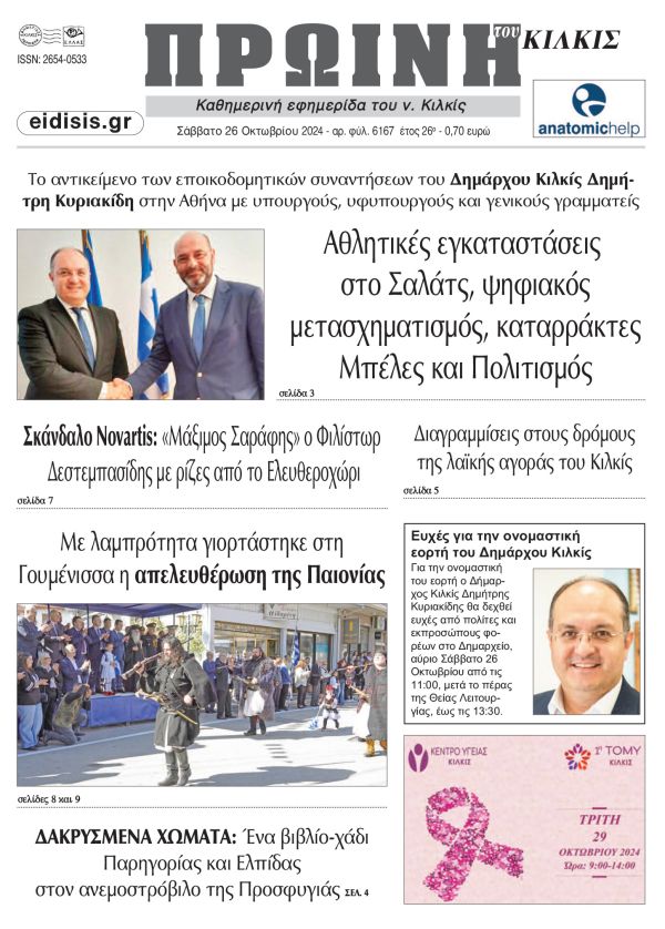 Διαβάστε το νέο πρωτοσέλιδο της Πρωινής του Κιλκίς, μοναδικής καθημερινής εφημερίδας του ν. Κιλκίς (26-10-2024)