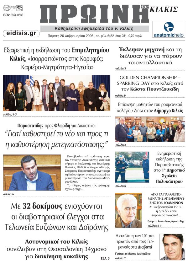 Διαβάστε το νέο πρωτοσέλιδο της Πρωινής του Κιλκίς, μοναδικής καθημερινής εφημερίδας του ν. Κιλκίς (26-2-2026)