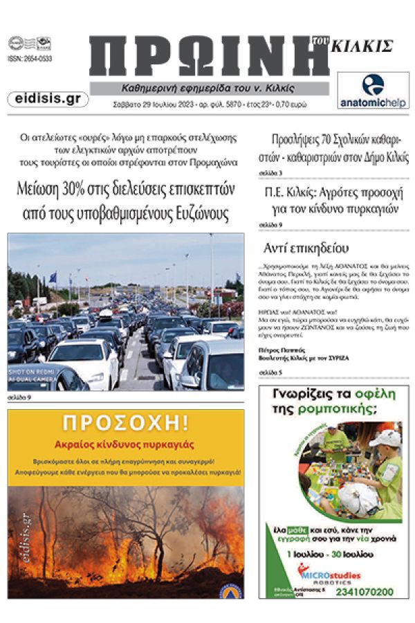Διαβάστε το νέο πρωτοσέλιδο της Πρωινής του Κιλκίς, μοναδικής καθημερινής εφημερίδας του ν. Κιλκίς (29-7-2023)